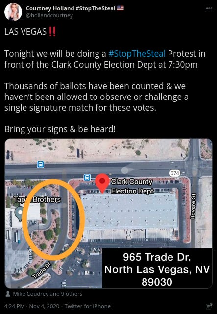 This tweet from @hollandcourtney is a call to action for Trump supporters to rally the Clark County election office in Nevada. Similar gatherings are occurring right now in Maricopa County, Arizona, and Detroit, Michigan.