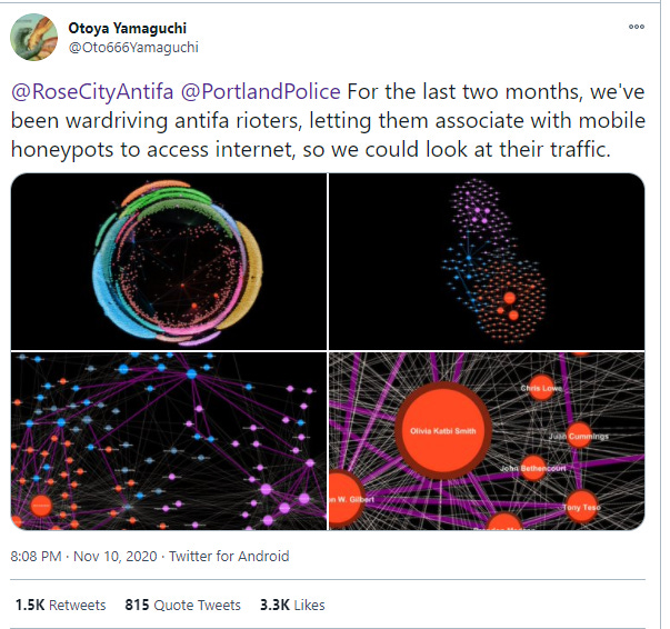 In one Twitter thread, @Oto666Yamaguchi (now suspended) claimed to have collected cell phone data on “antifa” in an effort to dox them. And in another Twitter thread, @We_Have_Risen claimed they were able to show reverse engineering of voting machine software from Dominion Systems, the election operations company.