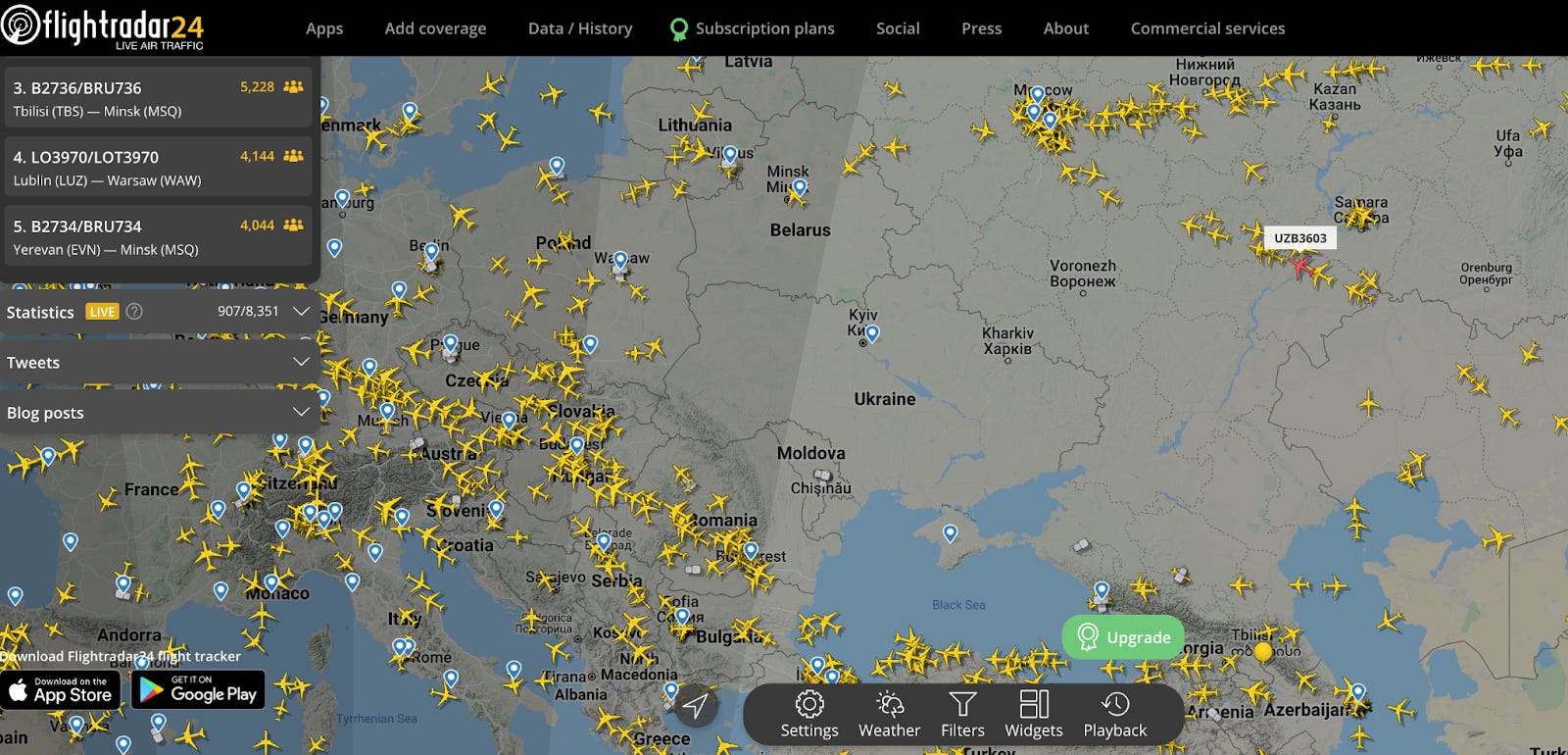 We and many other online open-source analysts have been using Flightradar to get an overview of flights within European and Russian airspace as the conflict continues. We noticed trends as they happened, such as flights being diverted as soon as the offensive began. There are also features that let you check out what others are watching (top tracked planes).