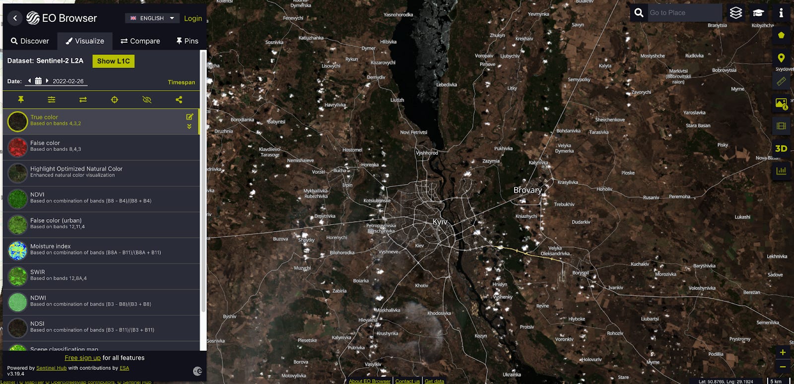 The European Space Agency offers a wealth of satellite imagery taken by their Sentinel2 satellite in orbit. Their catalog features frequent optical and radar satellite images, and open source intelligence analysts have methods to verify reports of clashes by looking for changes. The image resolution is lower than commercial counterparts like Maxar, PlanetLabs, and Capella.
