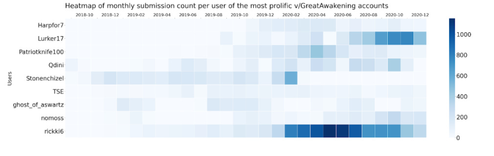 What more can be learned about disinformation from these members who managed to post hundreds of submissions in the course of a month? Interestingly, superspreader users were also prolific in the comment section, indicating that they didn’t act as simple media broadcasters and were instrumental in guiding debates to reinforce the dominant Qanon narratives. Most of these superspreaders joined the subverse during or after the Reddit ban, which suggests that the social hierarchy of the community was toppled by the r/GreatAwakening mass exodus and from the surge of popularity Voat enjoyed after QAnon communities were ousted from Reddit.
