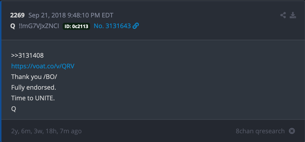 A few days later on Sept. 21, Q used one of their drops as a rallying cry to invite Reddit “refugees” to join forces on a platform called Voat. This Reddit clone, with a political stance centered on free speech, quickly became a safe haven for any fascist or hateful message board ousted by Reddit. Q aimed to centralize their community and thus invited one of their followers to create a new “subverse,” Voat’s equivalent to a subreddit message board, to welcome them.