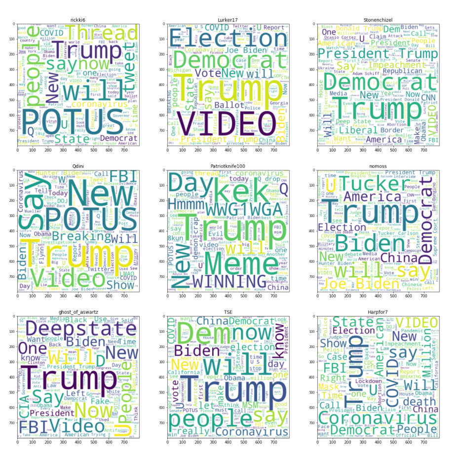 An analysis of the main keywords appearing in the submissions of these five individuals indicates a strong tendency to simply repeat the major themes among Q followers, such as the existence of a deep state, interpreting every action made by federal agencies as purposefully conspiratorial, and casting Donald Trump into a messianic role.