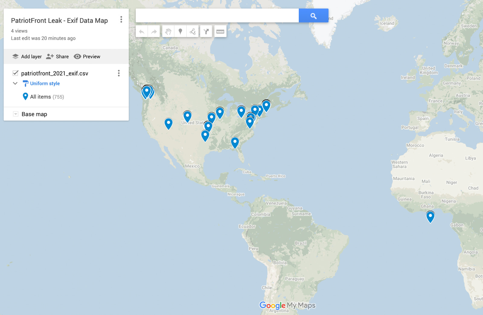 Where possible, LaBac members extracted the available EXIF data from media in the “activism” channel, where geolocation coordinates could then be placed on a map.