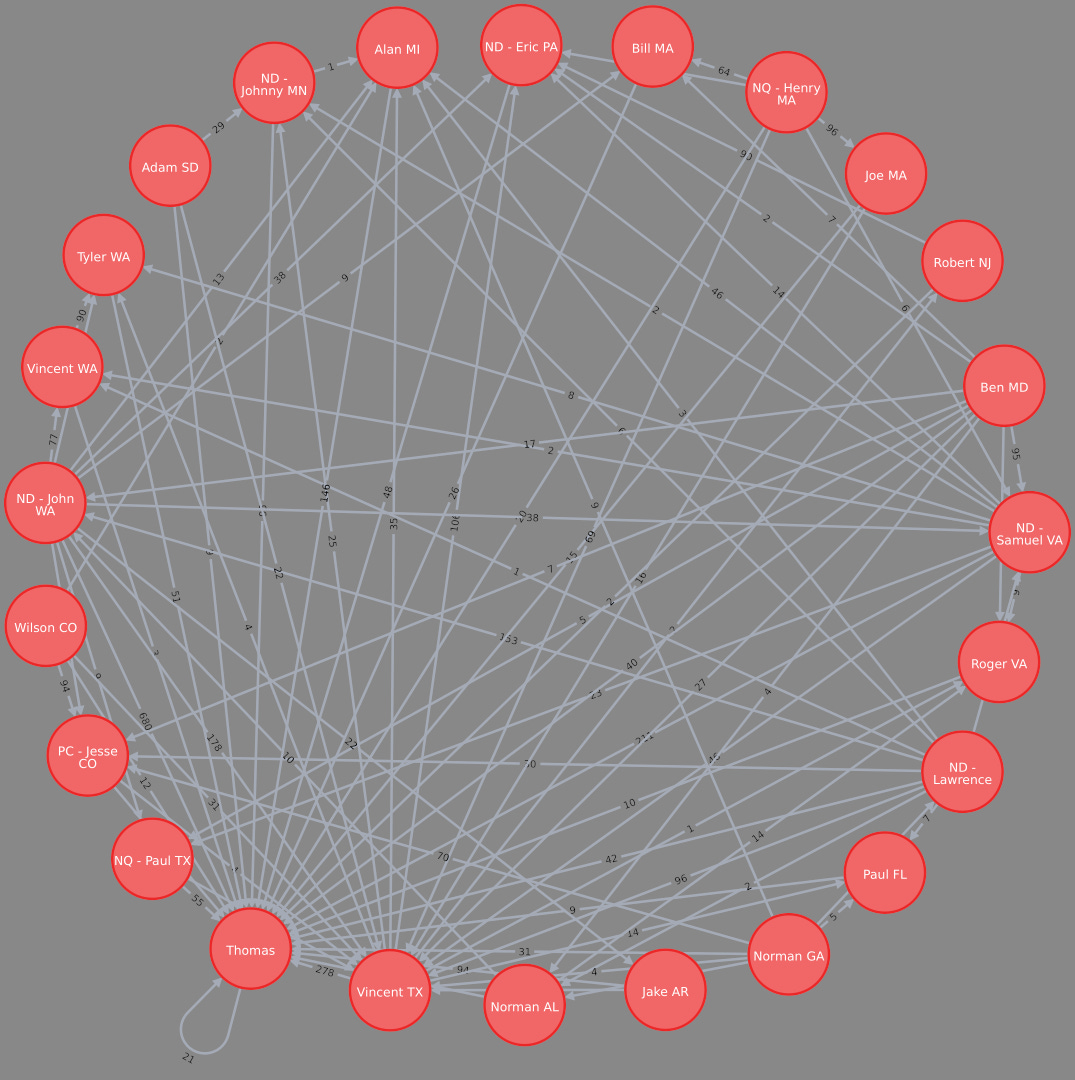Dependency graph depicting the most active PatriotFront members and their most popular recipients.