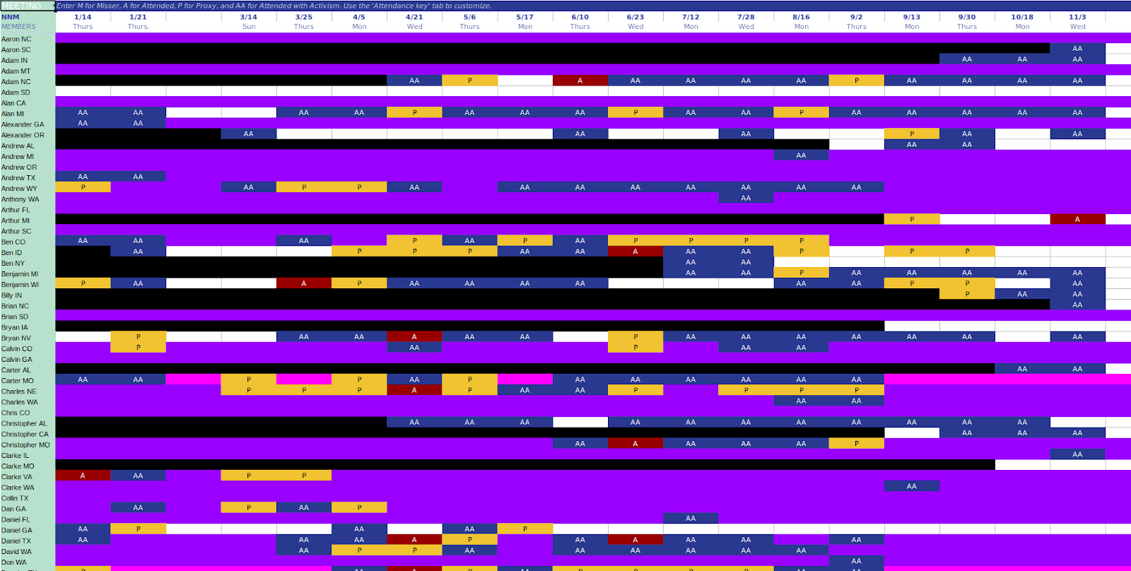 From the leak itself: an attendance sheet for PatriotFront members and their involvement in key meetings and trainings.